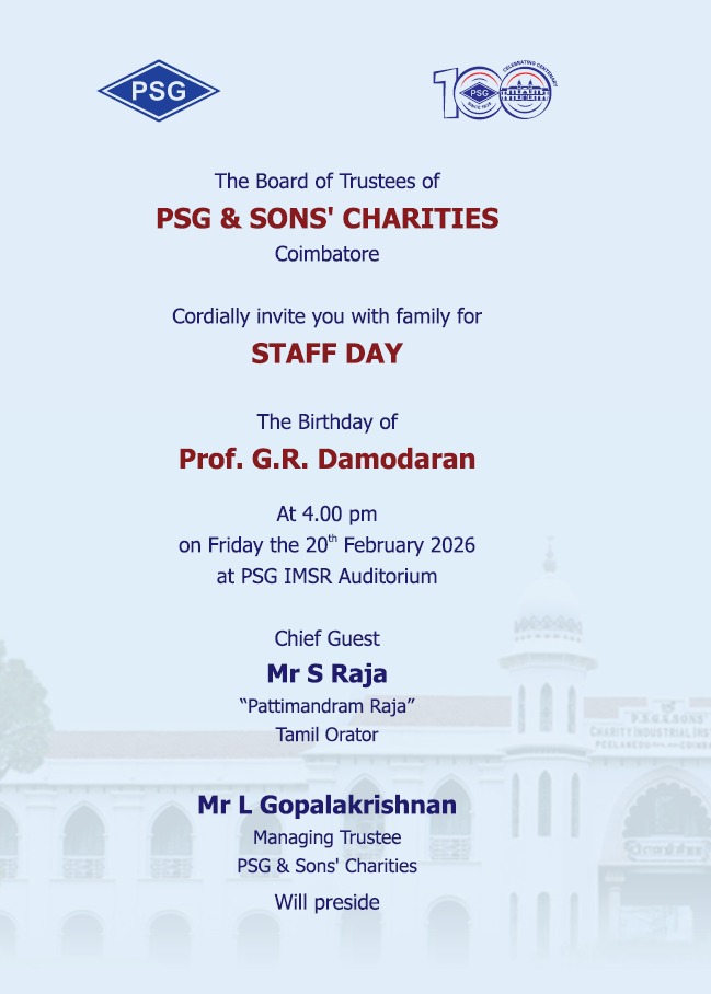 PSG Sons’ and Charities cordially invites you for Staff Day celebrations on 20th February 2026
